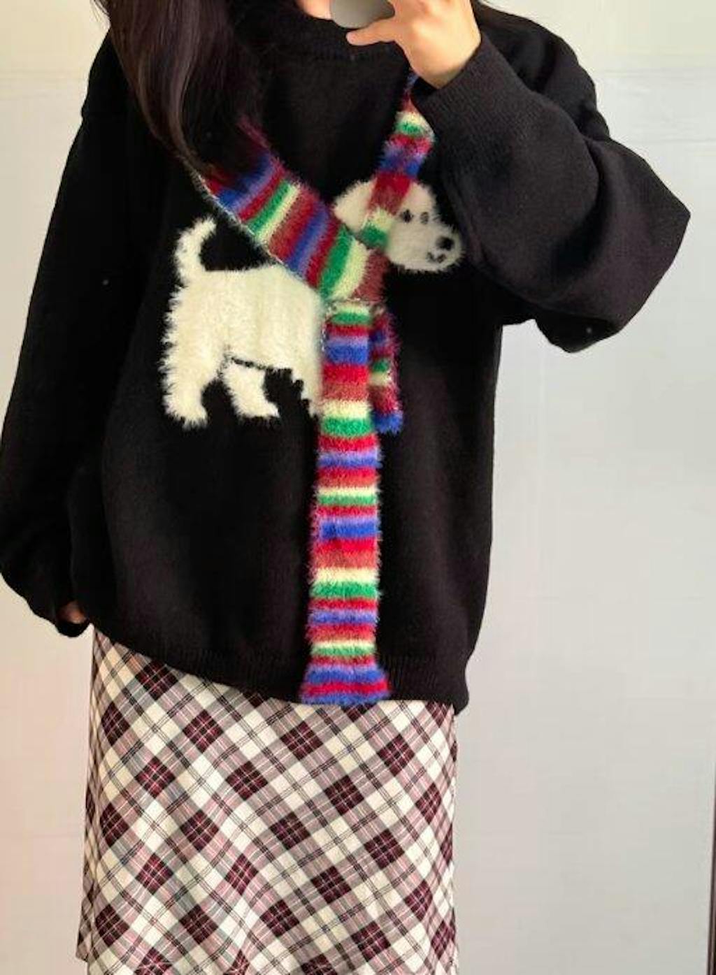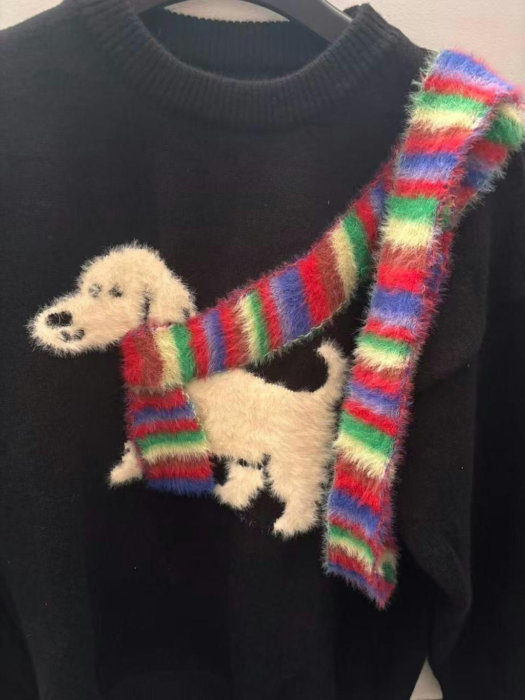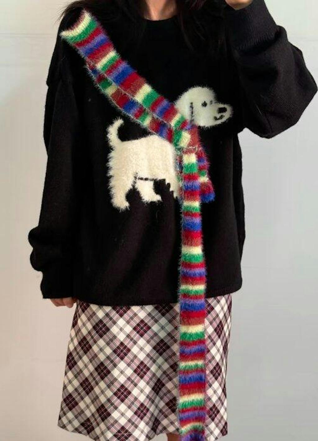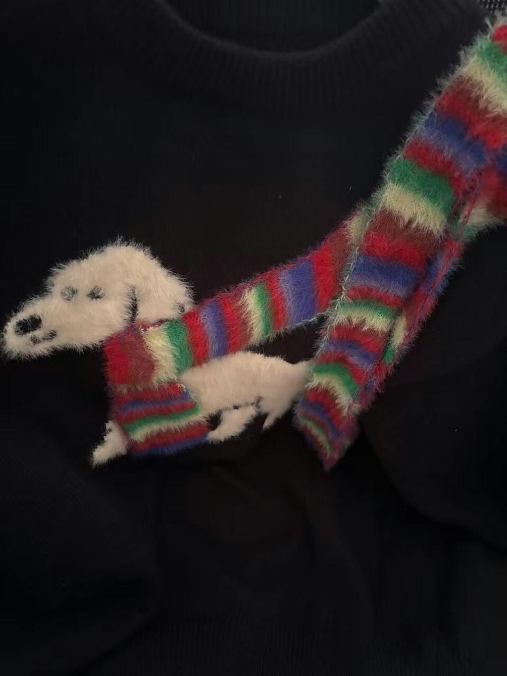胸元で小さなワンコが、彩り豊かなマフラーをぐるりと巻く。