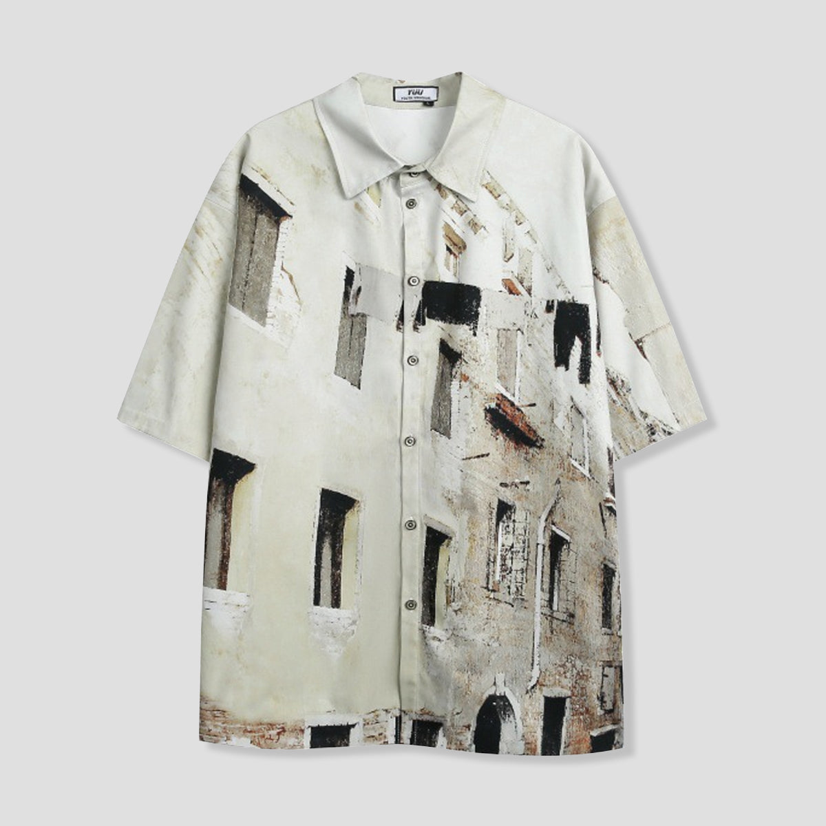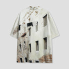古い建物の壁面を全面にプリントしたデザインシャツ。