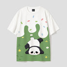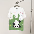 芝生の上で無邪気にごろごろ遊ぶ大熊猫をモチーフにした半袖Tシャツです。