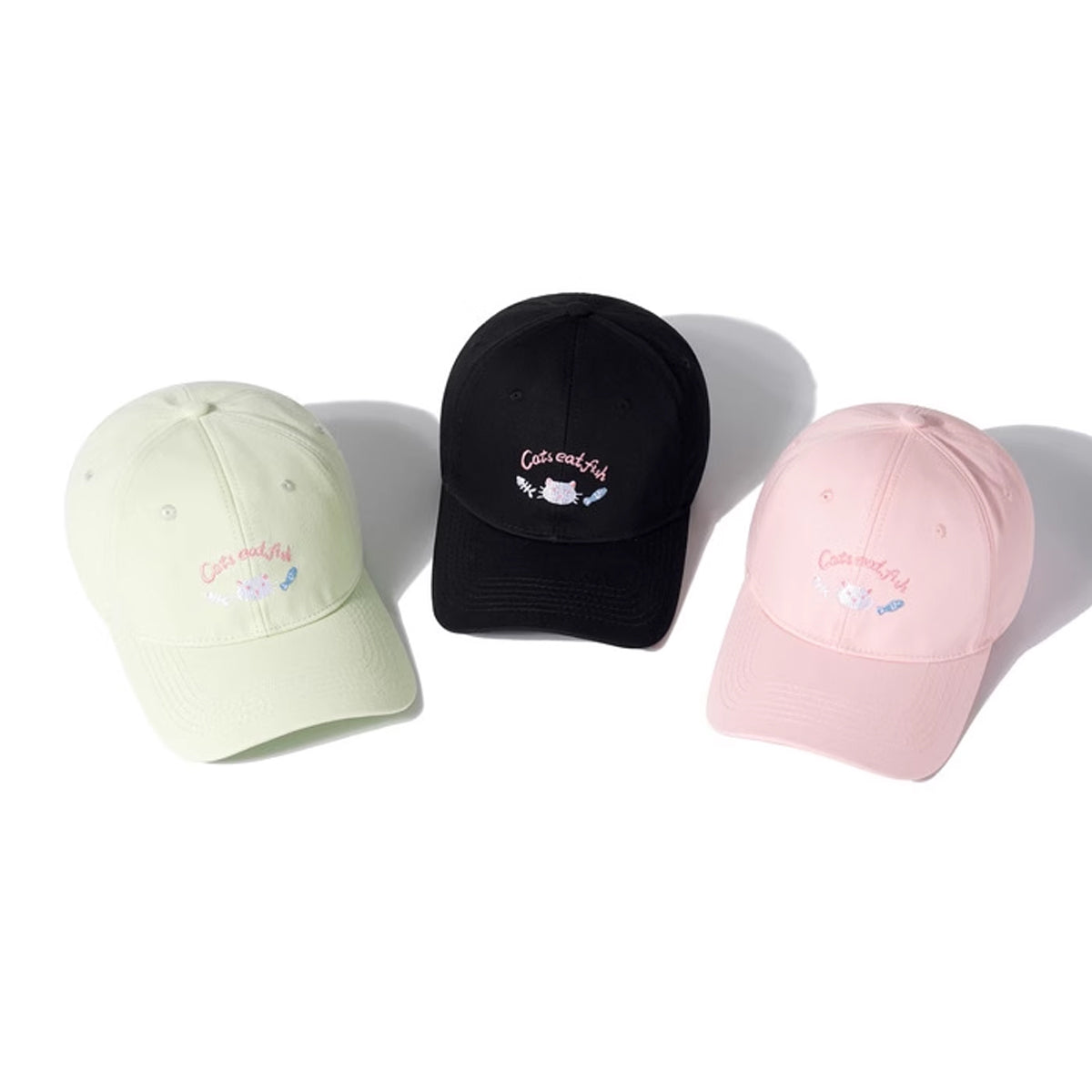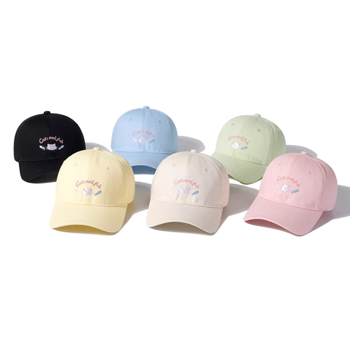 ・「Cats eat fish」のピンクの文字が、猫のグルメな日常を表現