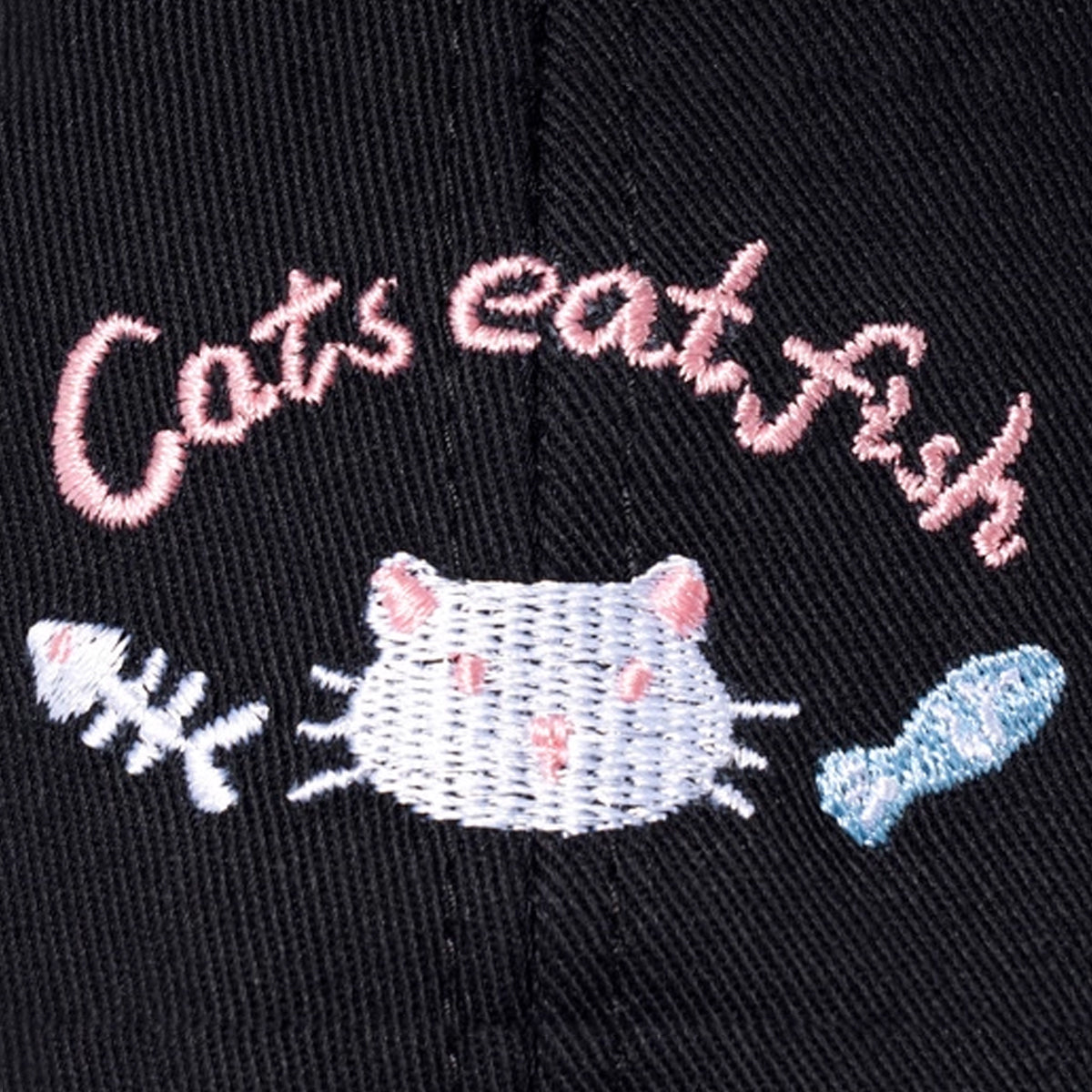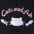 ピンクの刺繍で綴られた「Cats eat fish」の文字が、猫のグルメっぷりを語っています。