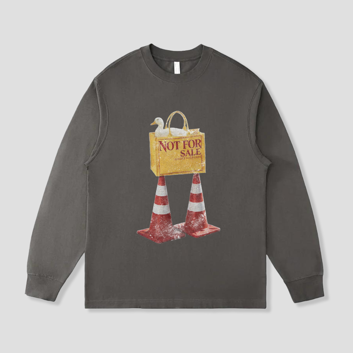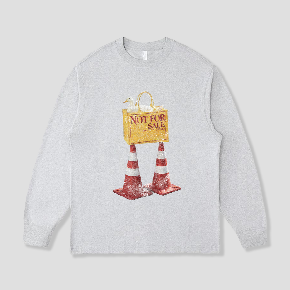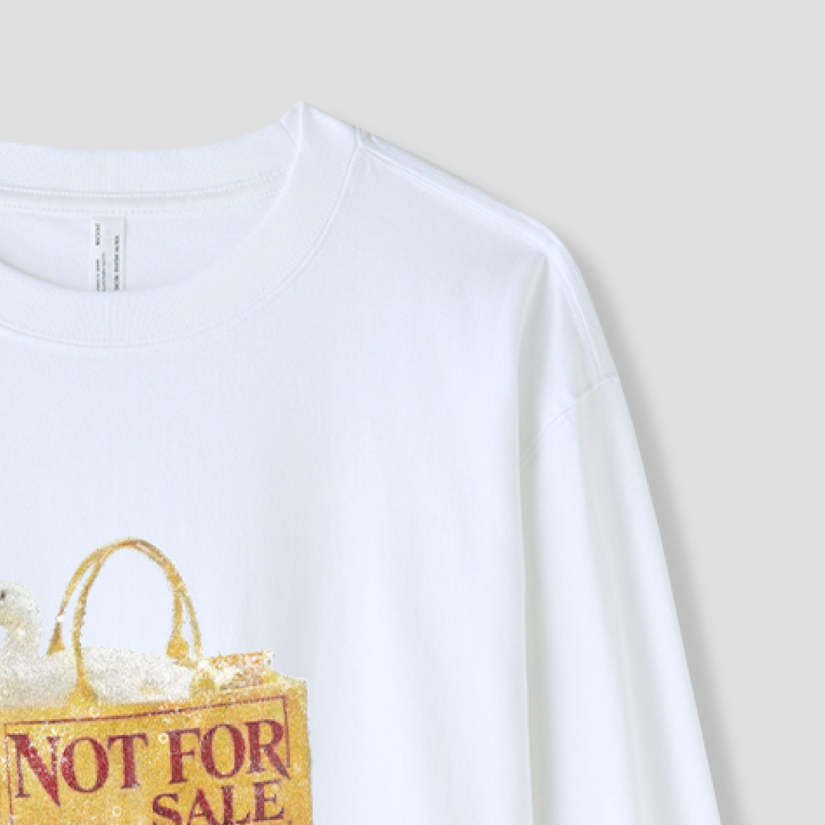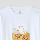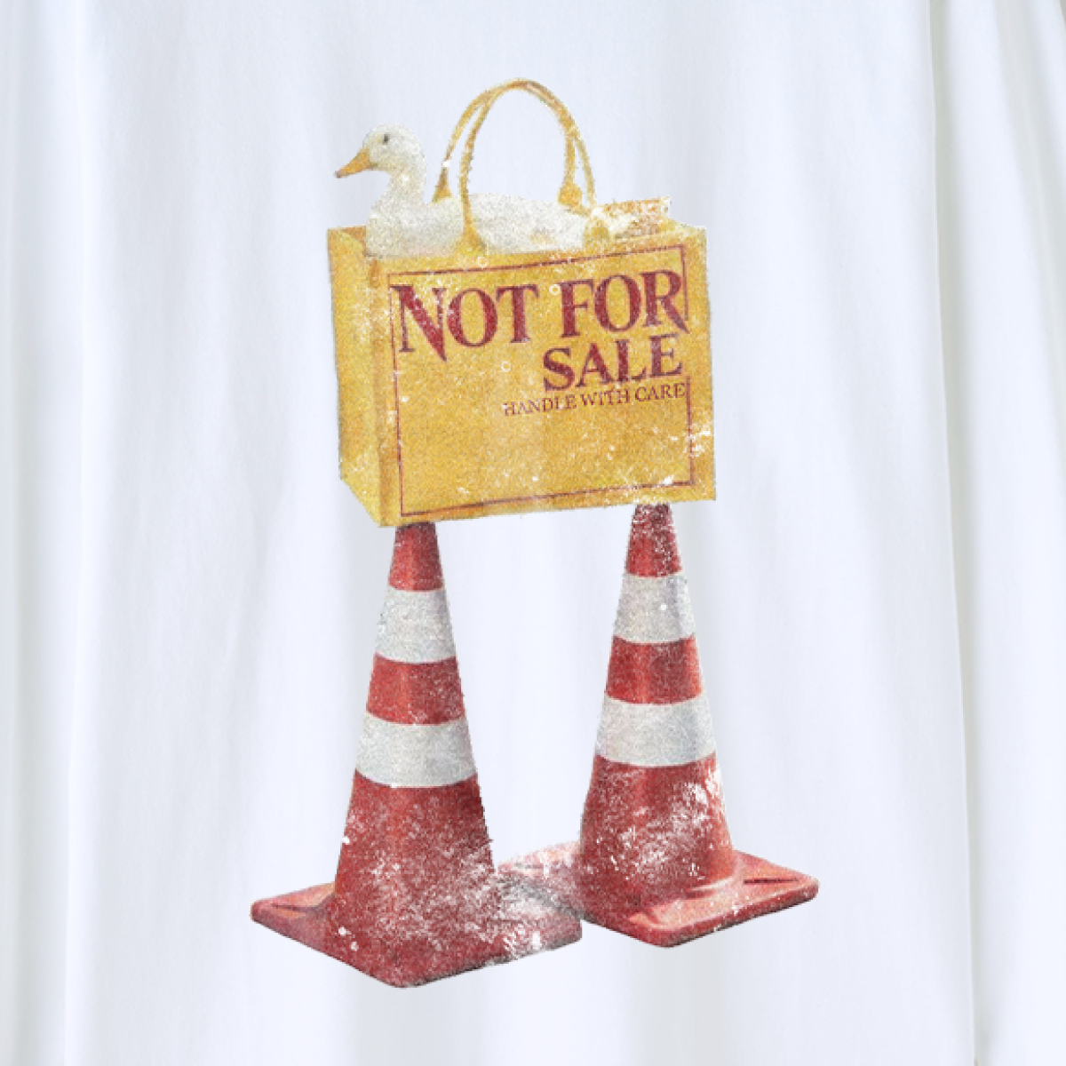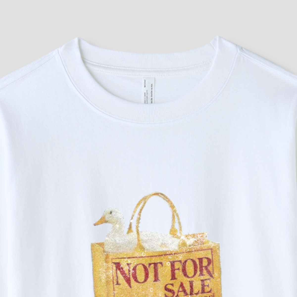 「NOT FOR SALE」と書かれたバッグに座る、小さなダック。