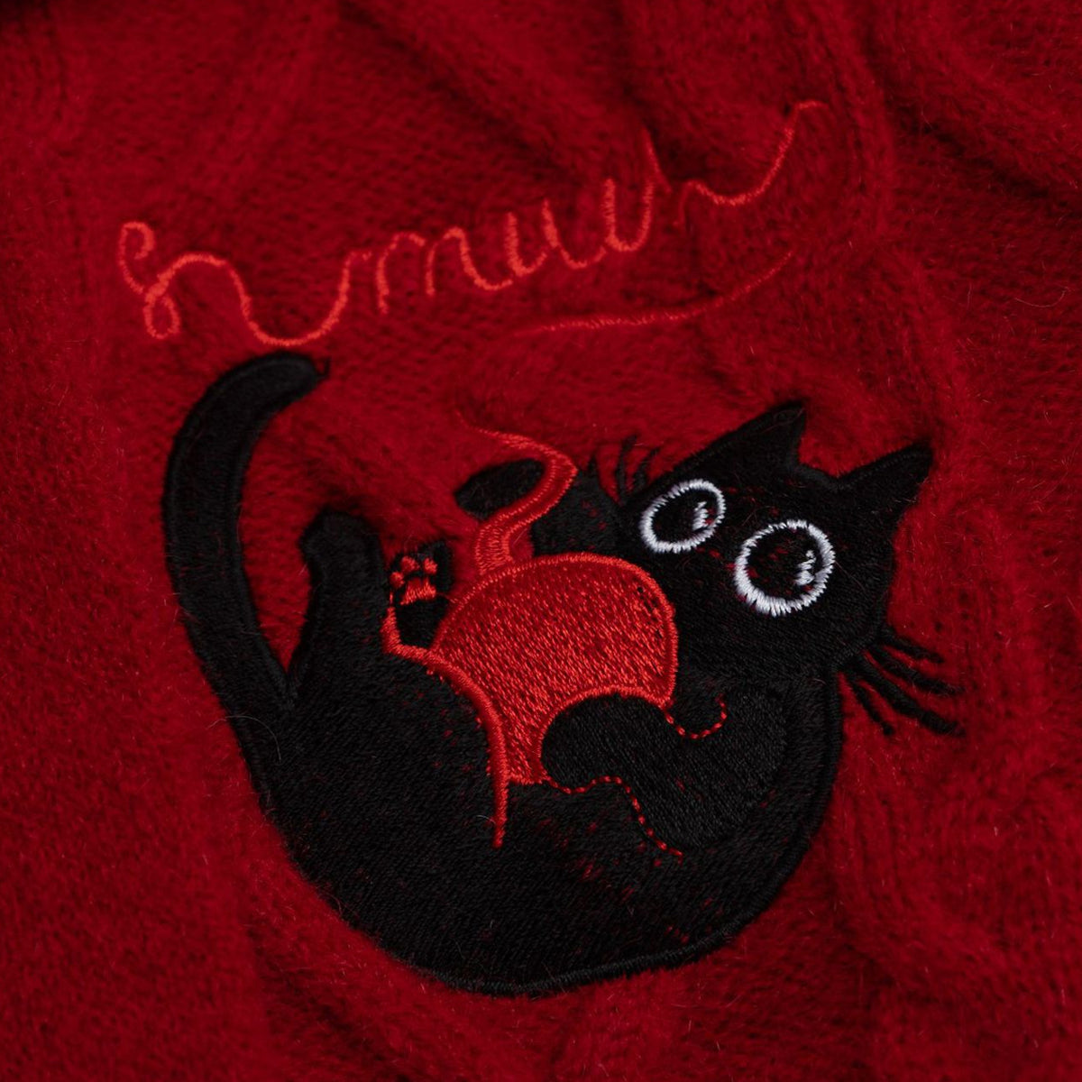 ・胸元の猫刺繍が遊び心たっぷりに目を惹く。