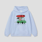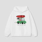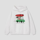 サーフボードを積んだ車で走る、ゆるタッチのロードトリップデザイン。