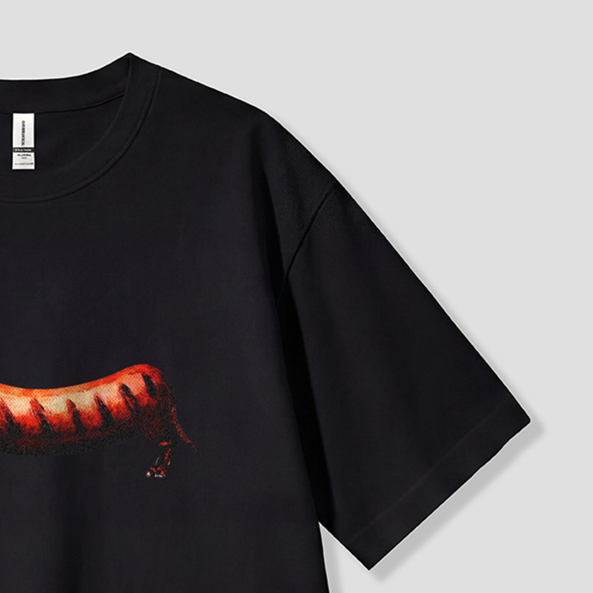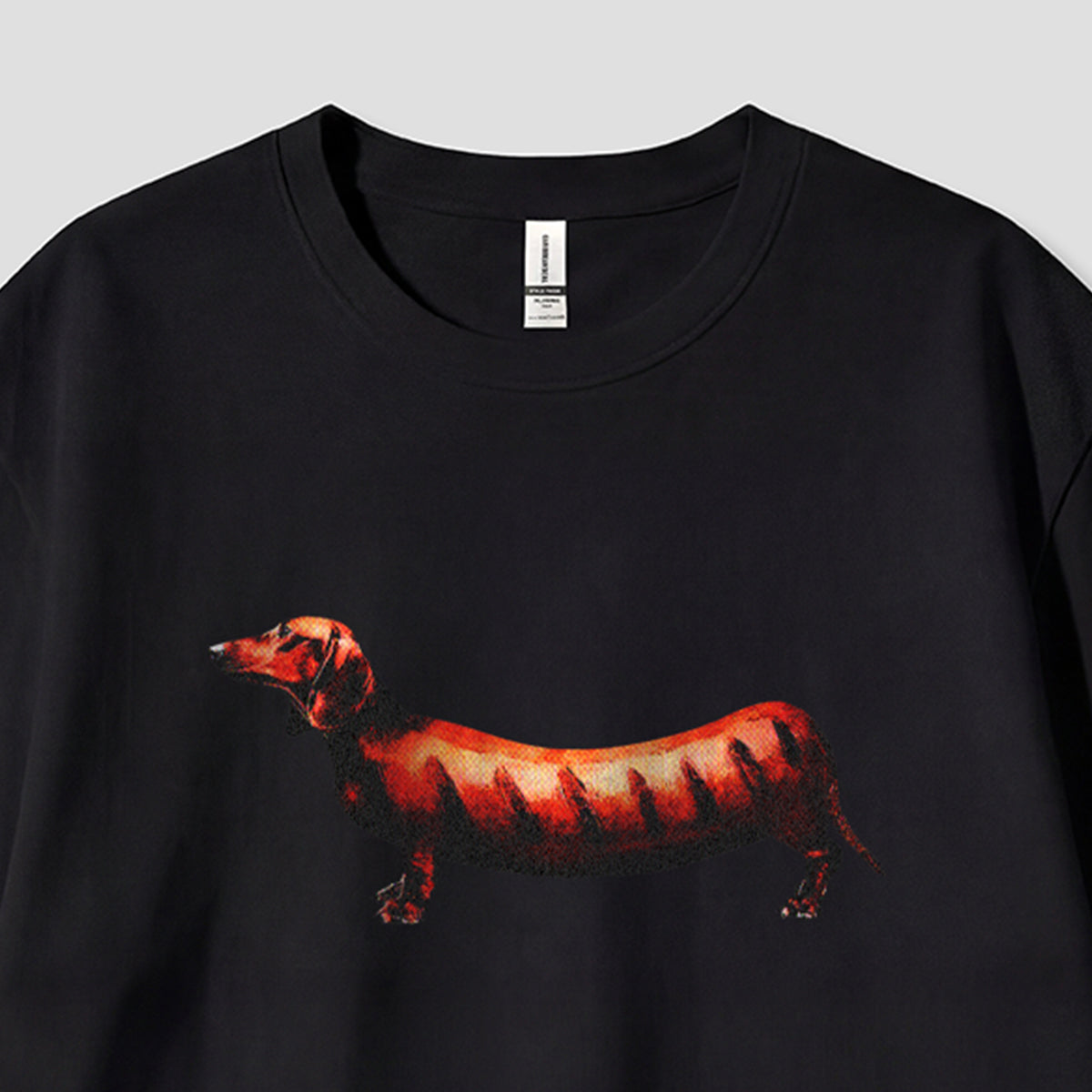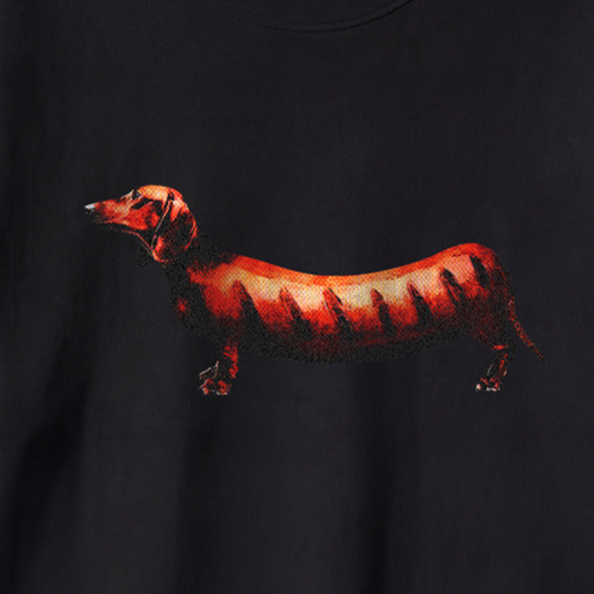 ・ダックスフンドのシルエットに炎モチーフを重ねた大胆なプリント。