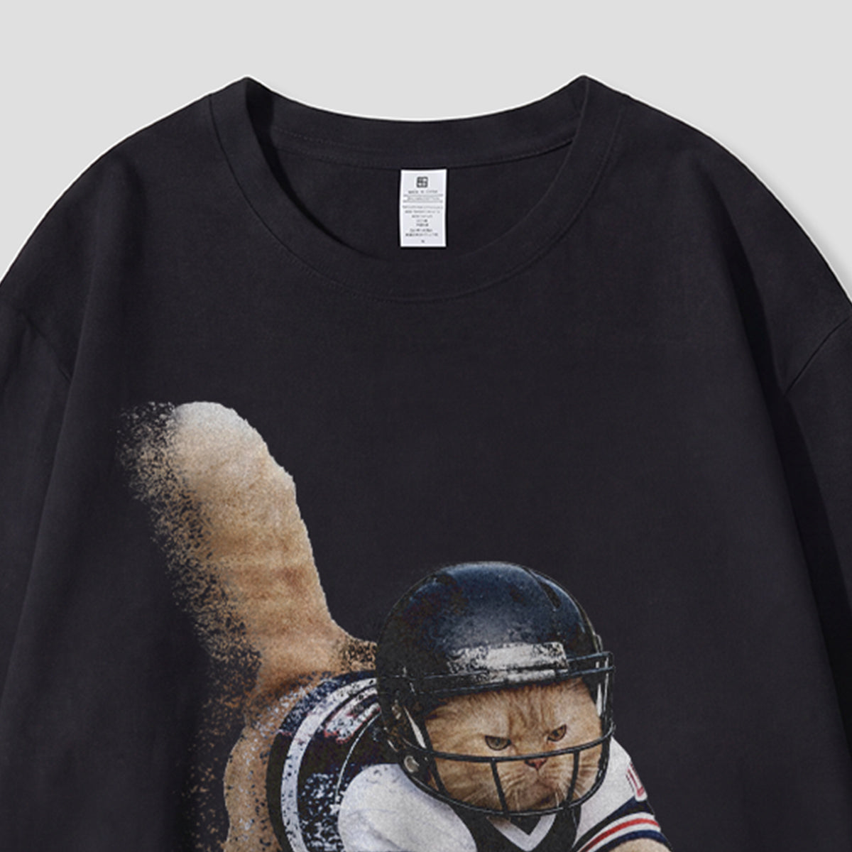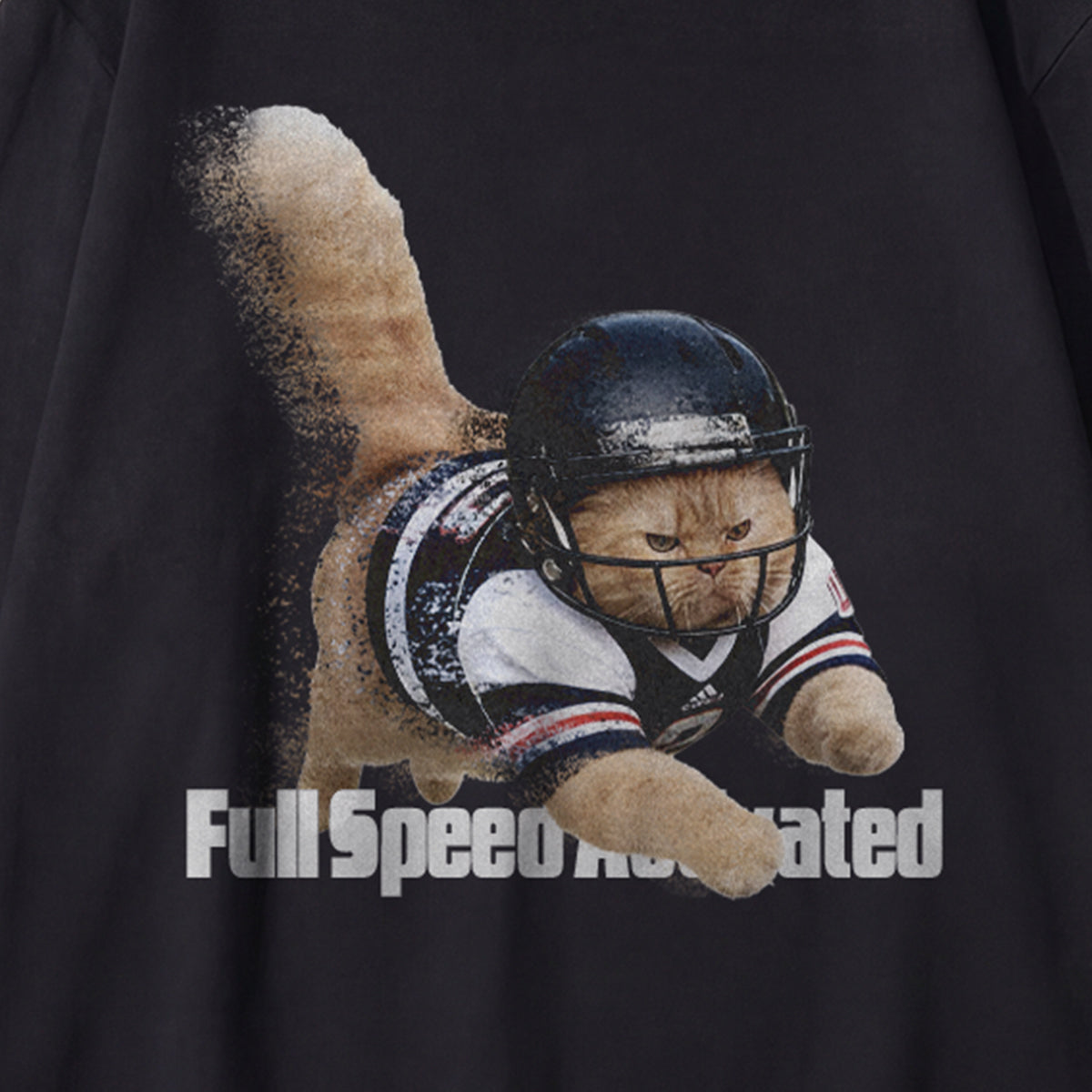 フル装備で突っ込む、ラグビー選手風キャットのフォトデザイン。