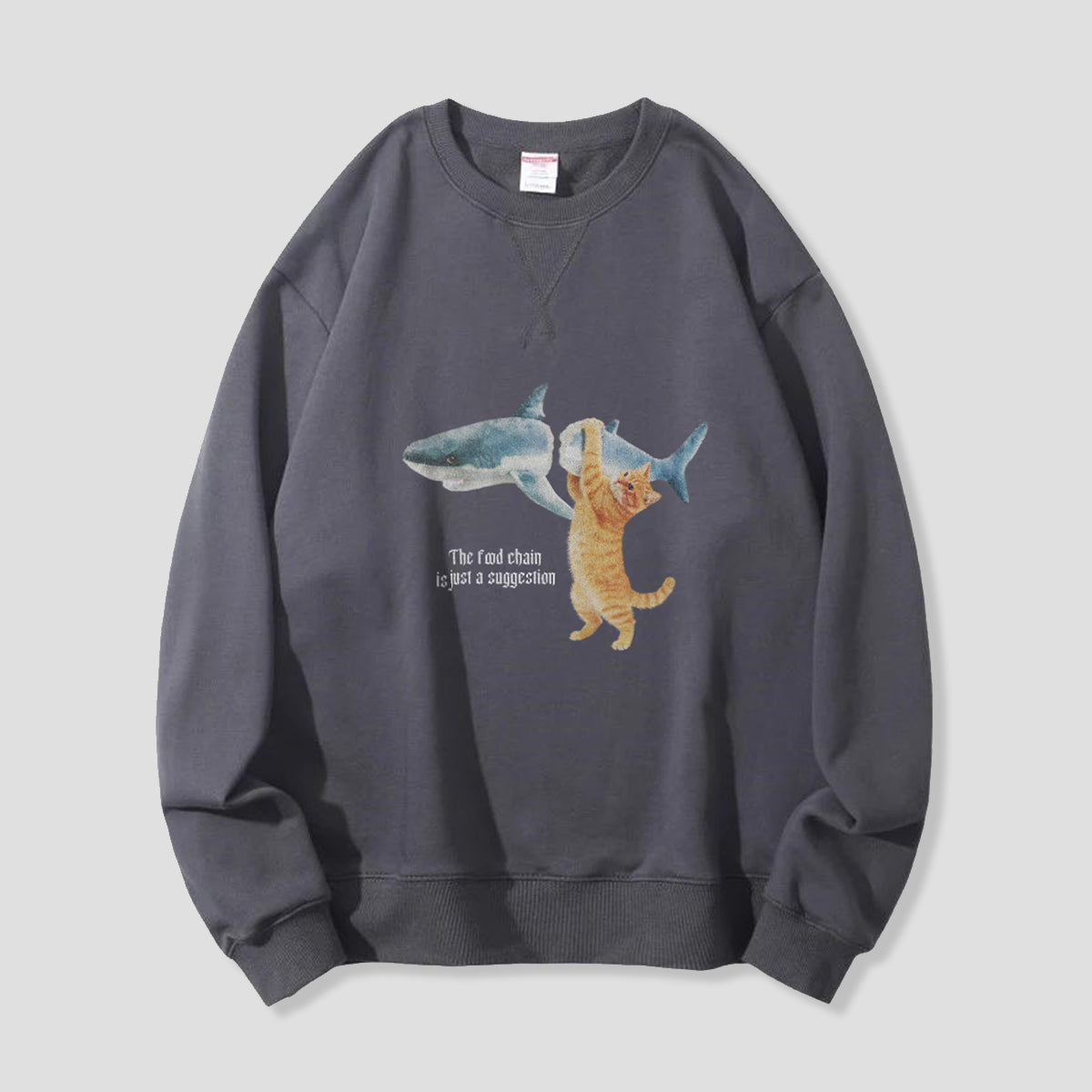 シャークとキャットの意外な関係を描いた、ユーモアあふれるグラフィックスウェット🦈🐱