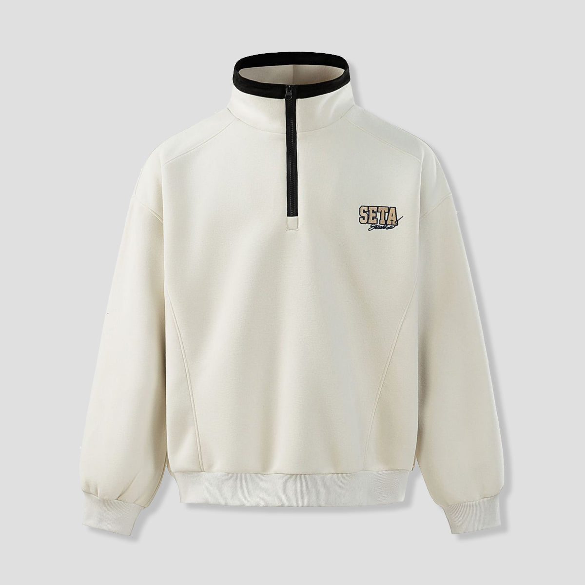 首元のハーフジップが、全体の印象を引き締める。