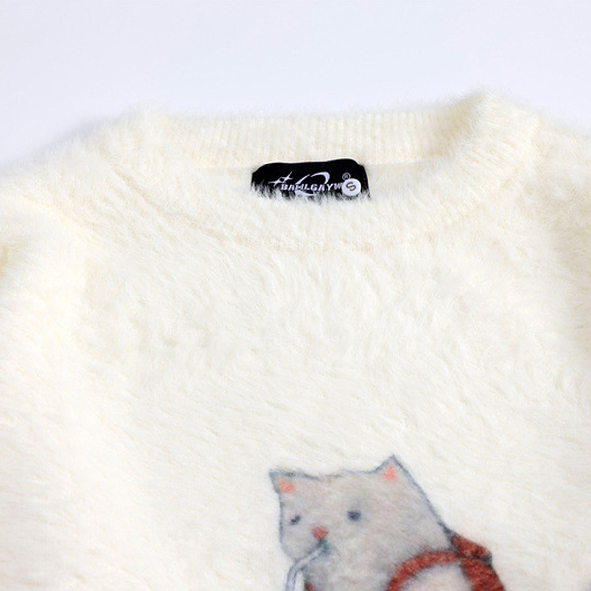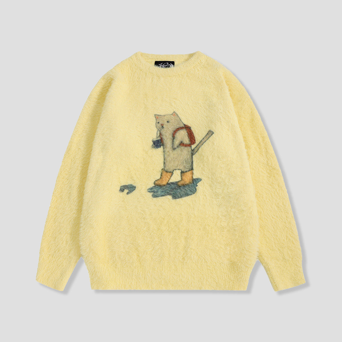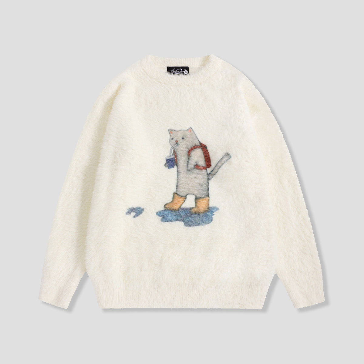・リュックを背負った猫のデザインが特徴的なセーター。